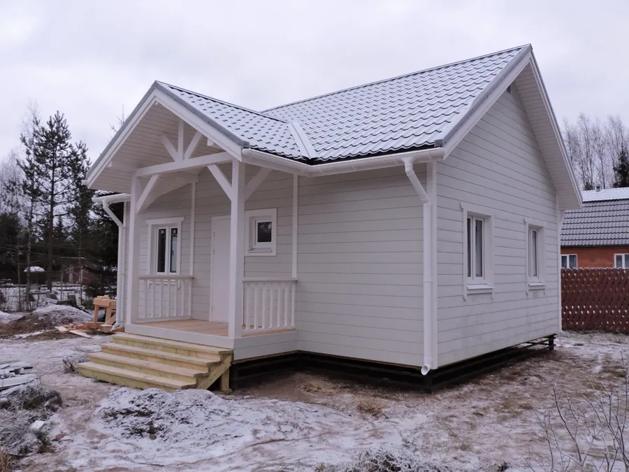 Дом размером 9х12м с крыльцом и террасой.